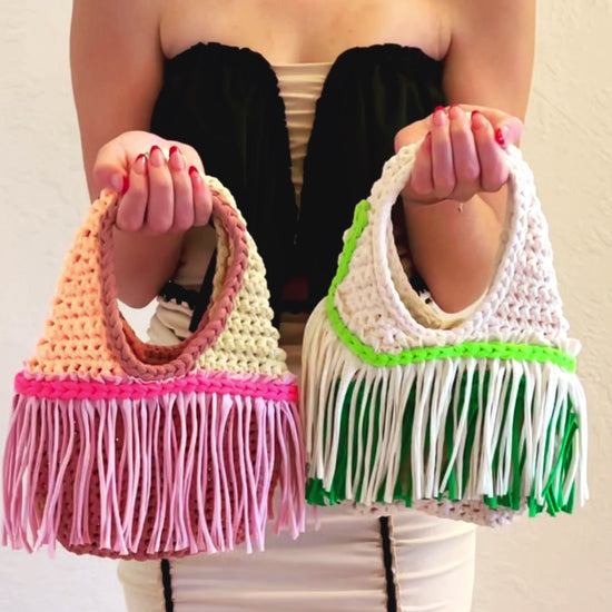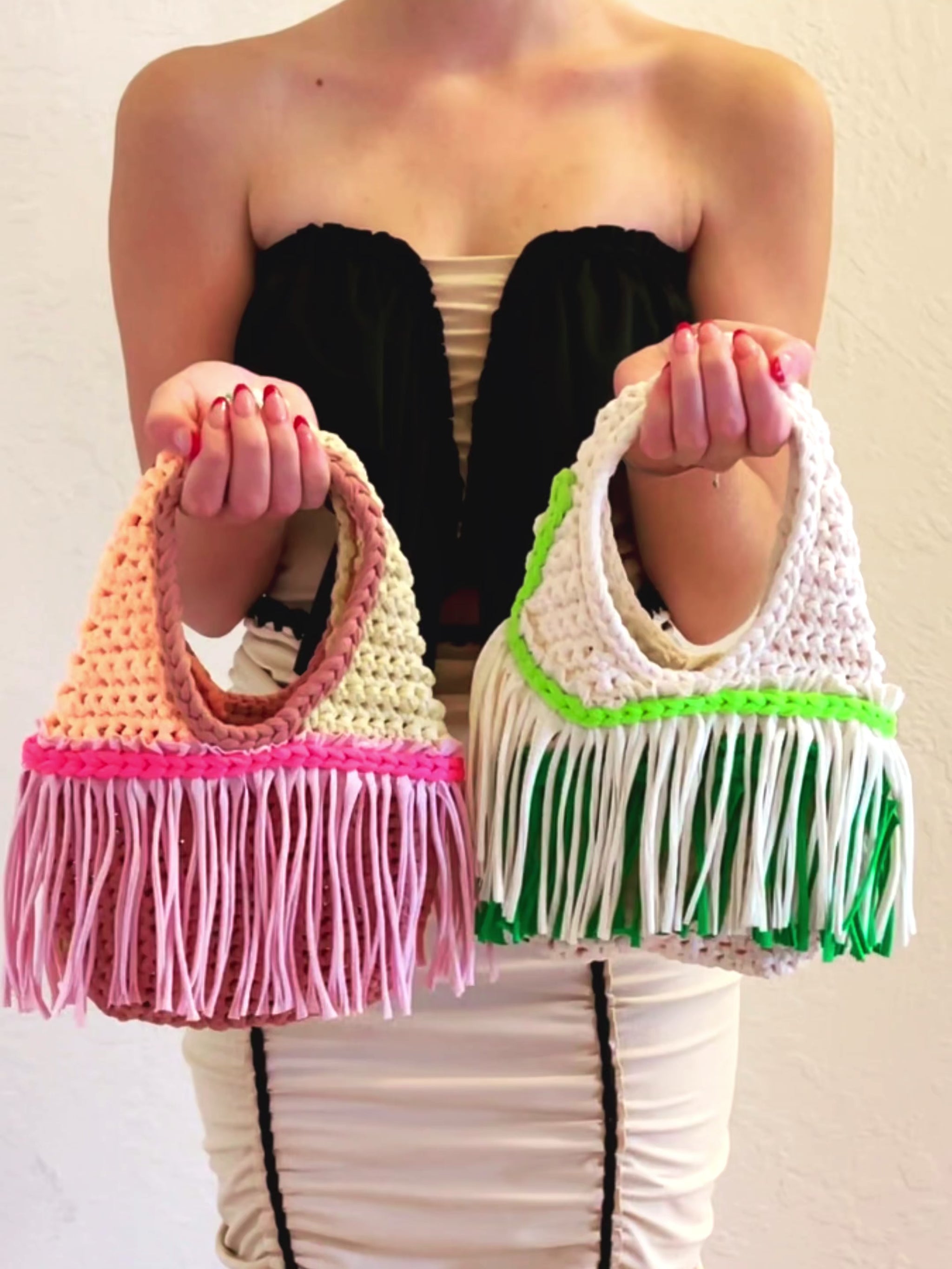 This clutch is super stretchy and features a single handle with one layer of braided fringe detailing on the lower half. The interior has a small, card sized pocket and a magnetic closure. All items are made of high quality nylon/spandex material.
