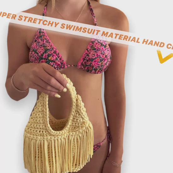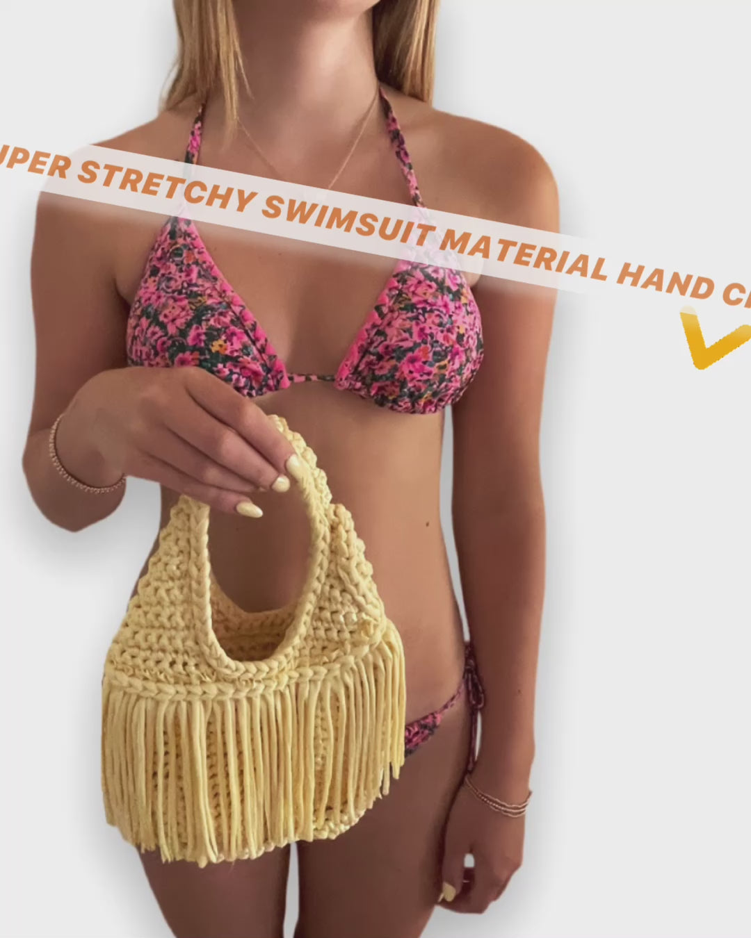 This handbag is super stretchy and features a single handle. It has two layers of braided fringe with flower detailing around the middle. The interior has a small, card sized pocket and a magnetic closure. All items are made of high quality nylon/spandex material.