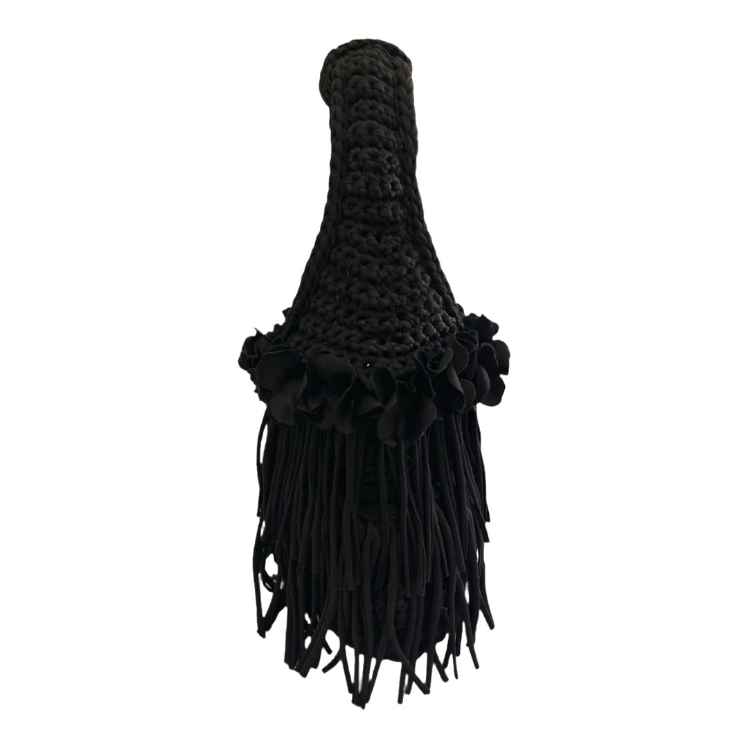 This handbag is super stretchy and features a single handle. It has two layers of braided fringe with flower detailing around the middle. The interior has a small, card sized pocket and a magnetic closure. All items are made of high quality nylon/spandex material.
