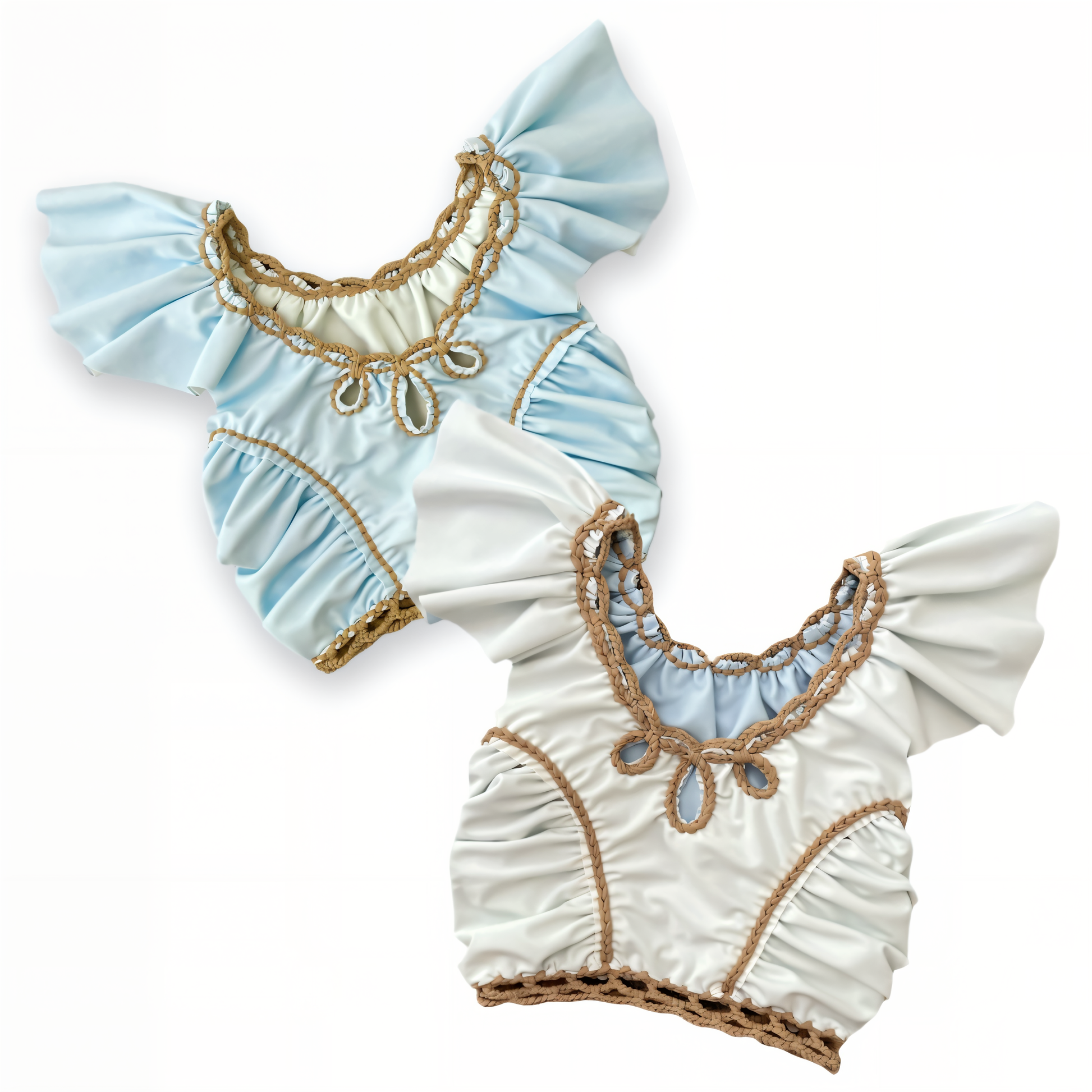 This super stretchy rodeo flutter sleeve top is hand crocheted and fully reversible. It features a sweetheart neckline with keyhole cut-outs. It is ruched and has flutter sleeves that can be worn on or off the shoulders. All items are made of high quality nylon/spandex material.