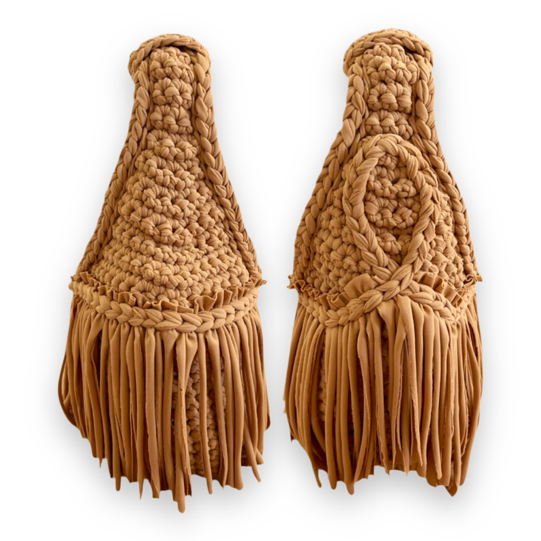 This clutch is super stretchy and features a single handle with one layer of braided fringe detailing on the lower half. There is a crocheted loop on one side. The interior has a small, card sized pocket and a magnetic closure. All items are made of high quality nylon/spandex material.