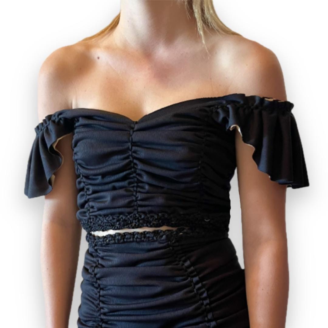 This super stretchy flutter sleeve top is hand crocheted and fully reversible. It is ruched and features a sweetheart neckline. The sleeves can be worn on or off the shoulders. All items are made of high quality nylon/spandex material.