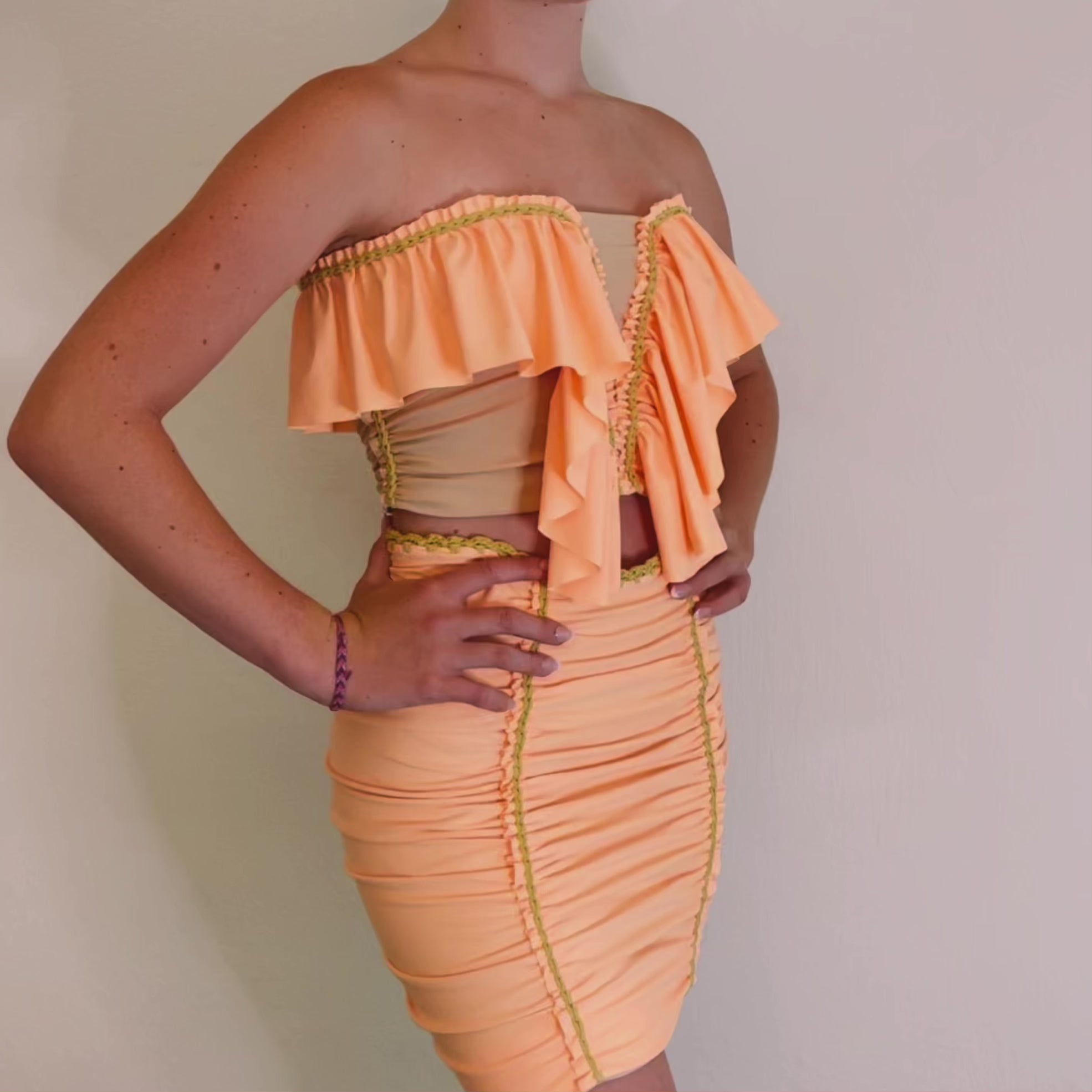 This super stretchy tube top is hand crocheted and features one continuous ruffle. It has a deep V sweetheart neckline and ruching on the sides. All items are made of high quality nylon/spandex material.