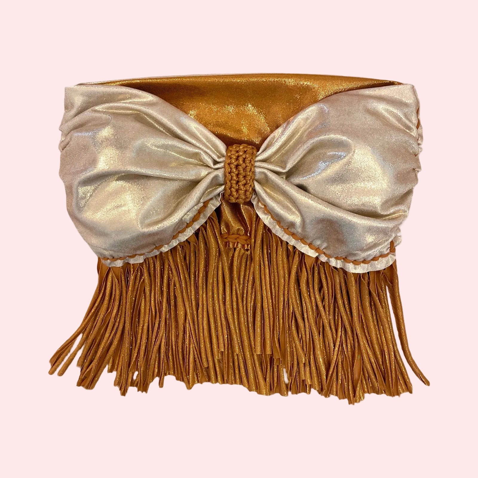 REVERSIBLE CROCHETED FRINGE BOW TOP • metallic copper and white gold