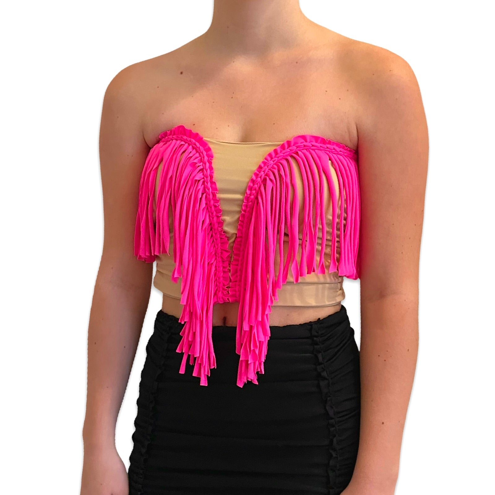 This super stretchy sweetheart fringe top is hand crocheted. It features a deep V neckline, ruched sides and fringe detailing all around. All items are made of high quality nylon/spandex material.