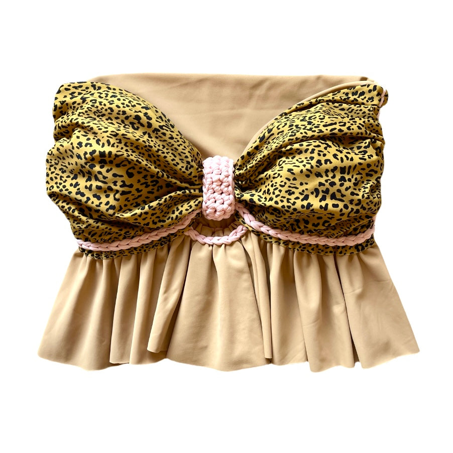 REVERSIBLE CROCHETED RUFFLE BOW TUBE TOP • cheetah print and sand with pink cord