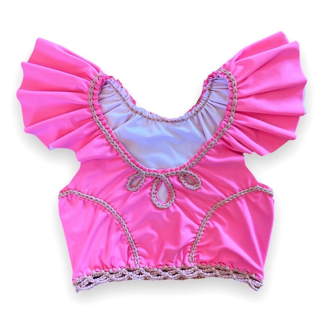 This super stretchy rodeo flutter sleeve top is hand crocheted and fully reversible. It features a sweetheart neckline with keyhole cut-outs. It is ruched and has flutter sleeves that can be worn on or off the shoulders. All items are made of high quality nylon/spandex material.
