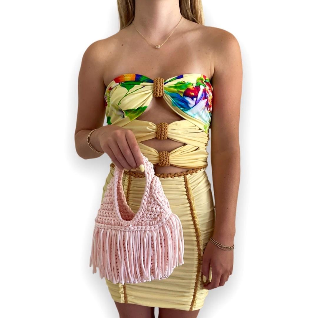 TWO PIECE SET 3 bow tube top and matching mini skirt • light yellow and leather with floral print