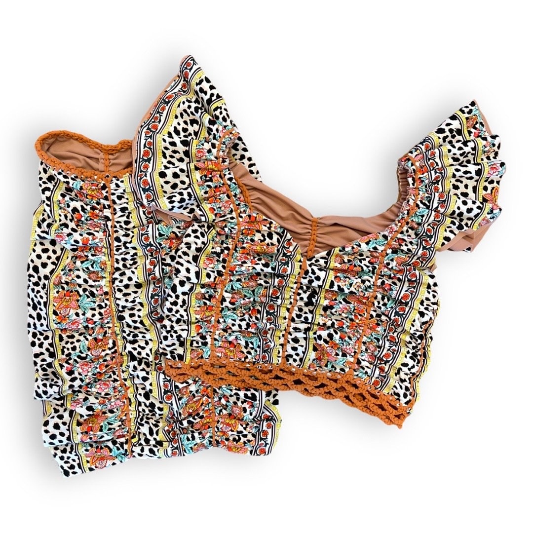This matching set includes the flutter sleeve top and the pencil mini skirt. Both items are super stretchy, hand crocheted and fully reversible. The top features a sweetheart neckline and flutter sleeves that can be worn on or off the shoulders. The skirt is ruched and can be worn ultra short or just above the knee. All items are made of high quality nylon/spandex material.